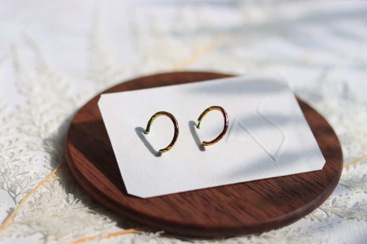 小さなフープピアスがシンプルに耳元を飾ります。