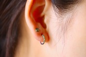 小さなフープピアスがシンプルに耳元を飾ります。